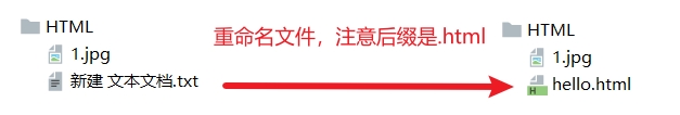 第二步:创建一个文本文件,然后修改文件名为 hello.html,注意文件的后缀是.html,如下图所示: