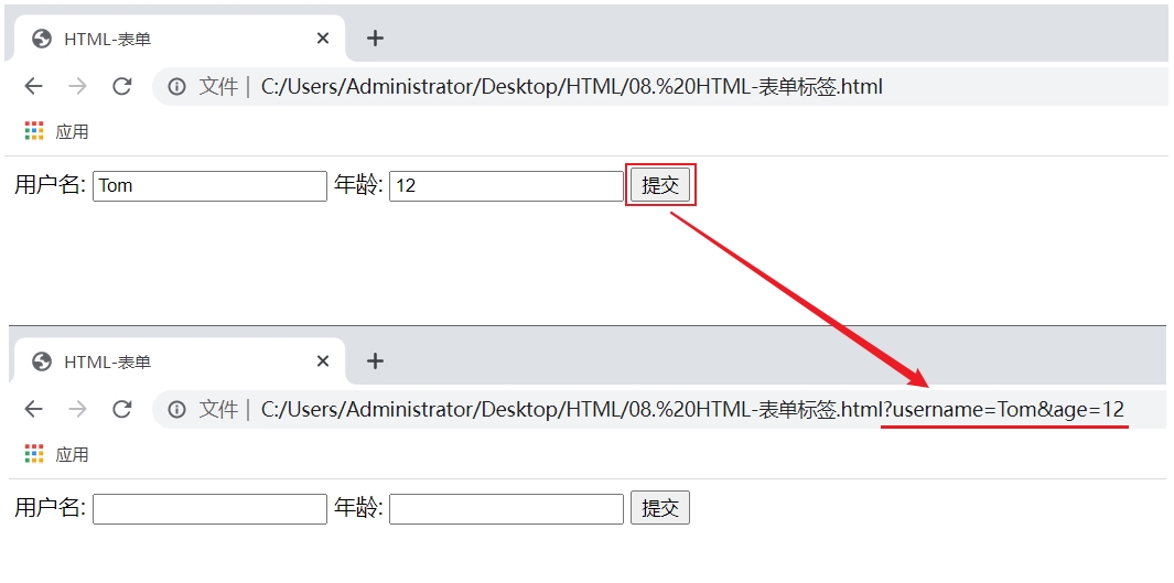 </html>表单编写完毕之后,通过浏览器打开此表单,然后再表单项中录入值之后,点击提交,我们会看到表单的数据在 url 后面提交到服务端,格式为:?username=Tom&age=12。