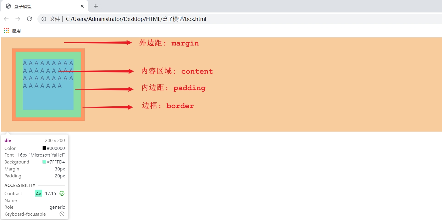 下面展示的是一段 html 代码 及 CSS 样式 经过浏览器解析,呈现的效果如右图所示: