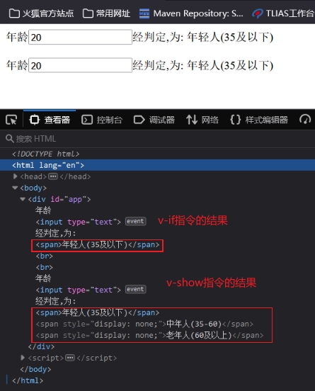 <span v-show="age >= 60">老年人(60及以上)</span>
