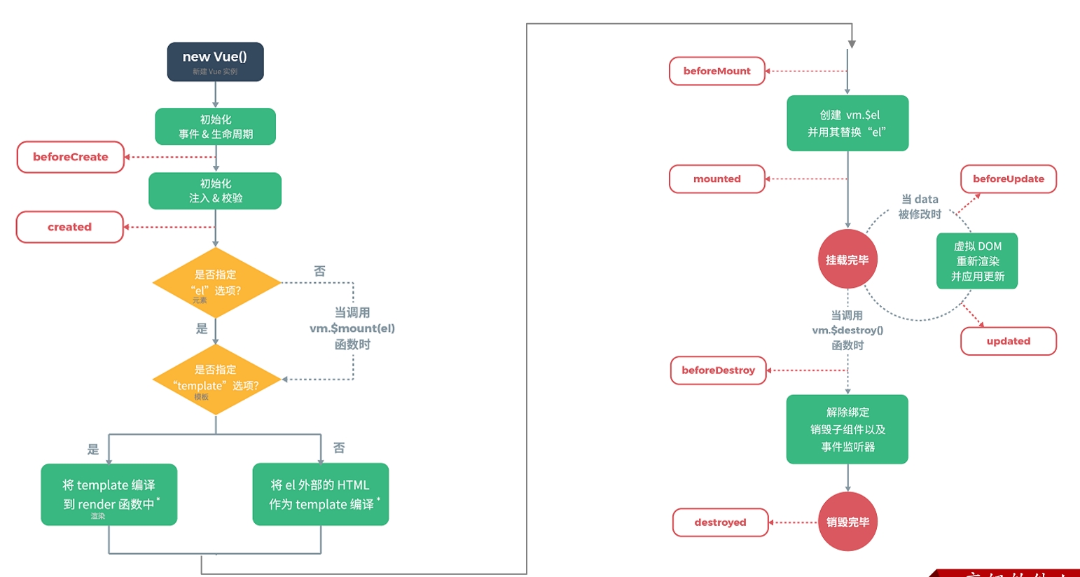 下图是 Vue 官网提供的从创建 Vue 到效果 Vue 对象的整个过程及各个阶段对应的钩子函数: