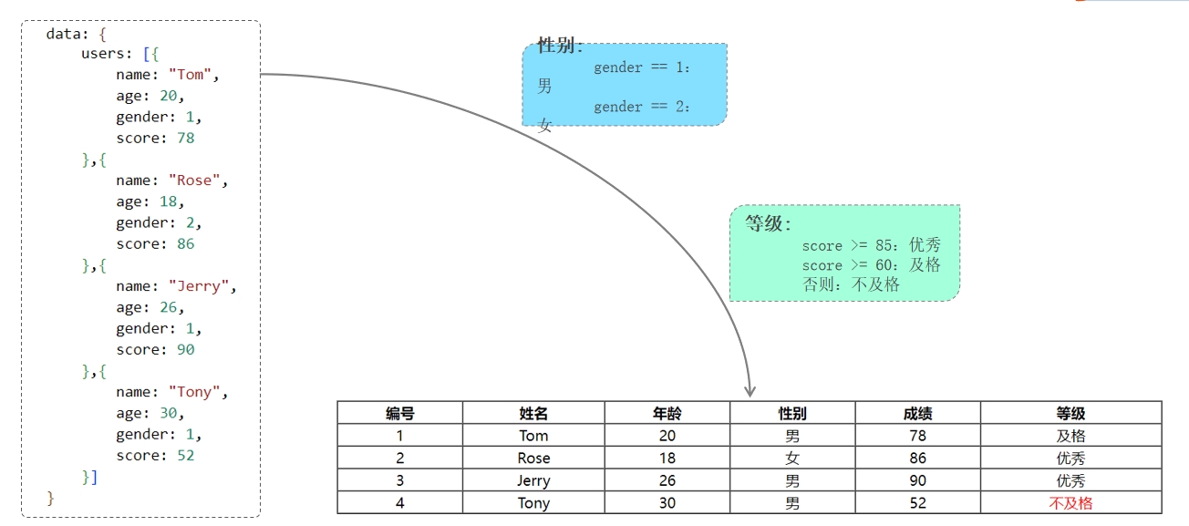 1668868100828 如上图所示,我们提供好了数据模型,users是数组集合,提供了多个用户信息。然后我们需要将数据以表格的形式,展示到页面上,其中,性别需要转换成中文男女,等级需要将分数数值转换成对应的等级。