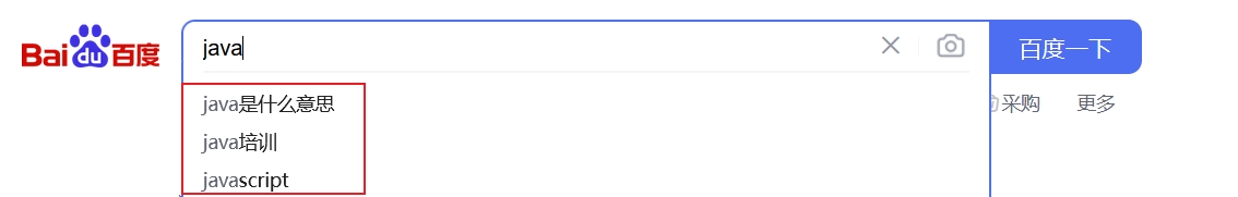 如下图所示,当我们再百度搜索java时,下面的联想数据是通过Ajax请求从后台服务器得到的,在整个过程中,我们的Ajax请求不会导致整个百度页面的重新加载,并且只针对搜索栏这局部模块的数据进行了数据的更新,不会对整个页面的其他地方进行数据的更新,这样就大大提升了页面的加载速度,用户体验高。