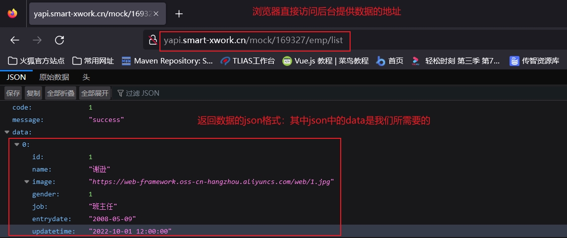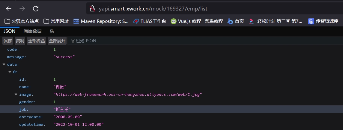 mounted () { //发送异步请求,加载数据 axios.get("http://yapi.smart-xwork.cn/mock/169327/emp/list").then(result => { }) }ajax请求的数据我们应该绑定给vue的data属性,之后才能进行数据绑定到视图;并且浏览器打开后台地址,数据返回格式如下图所示: