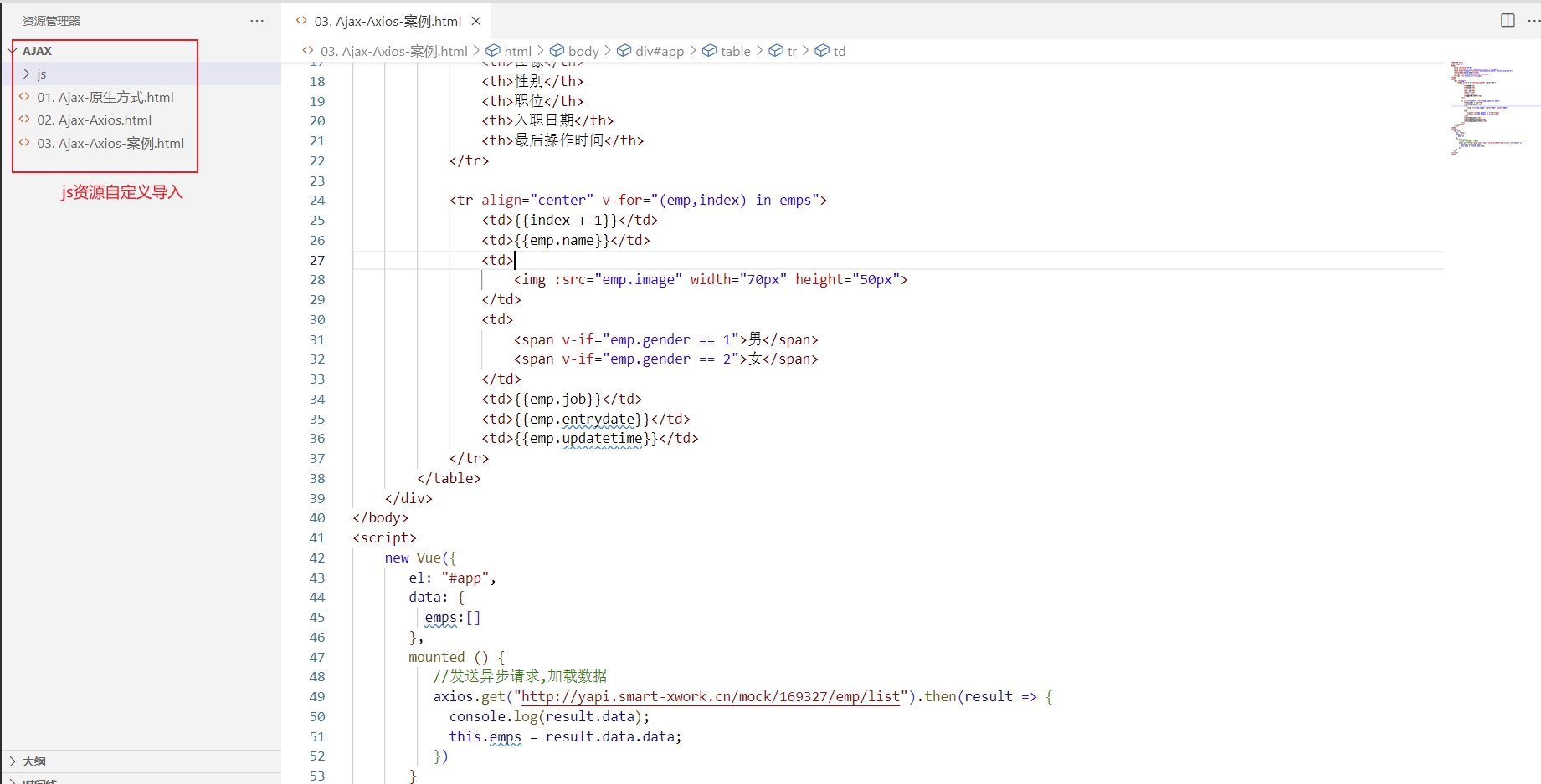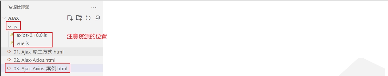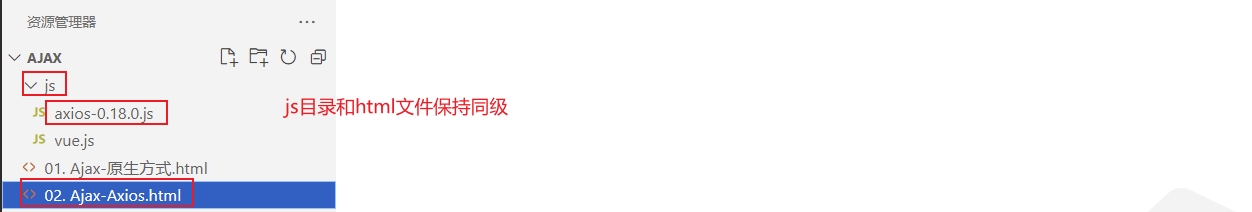 首先在VS Code中创建js文件夹,与html同级,然后将资料/axios-0.18.0.js 文件拷贝到js目录下,然后创建名为02. Ajax-Axios.html的文件,工程结果如图所示: