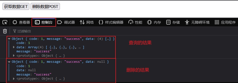 //通过axios发送异步请求-post axios({ method: "post", url: "http://yapi.smart-xwork.cn/mock/169327/emp/deleteById", data: "id=1" }).then(result => { console.log(result.data); })浏览器打开,f12抓包,然后分别点击2个按钮,查看控制台效果如下: