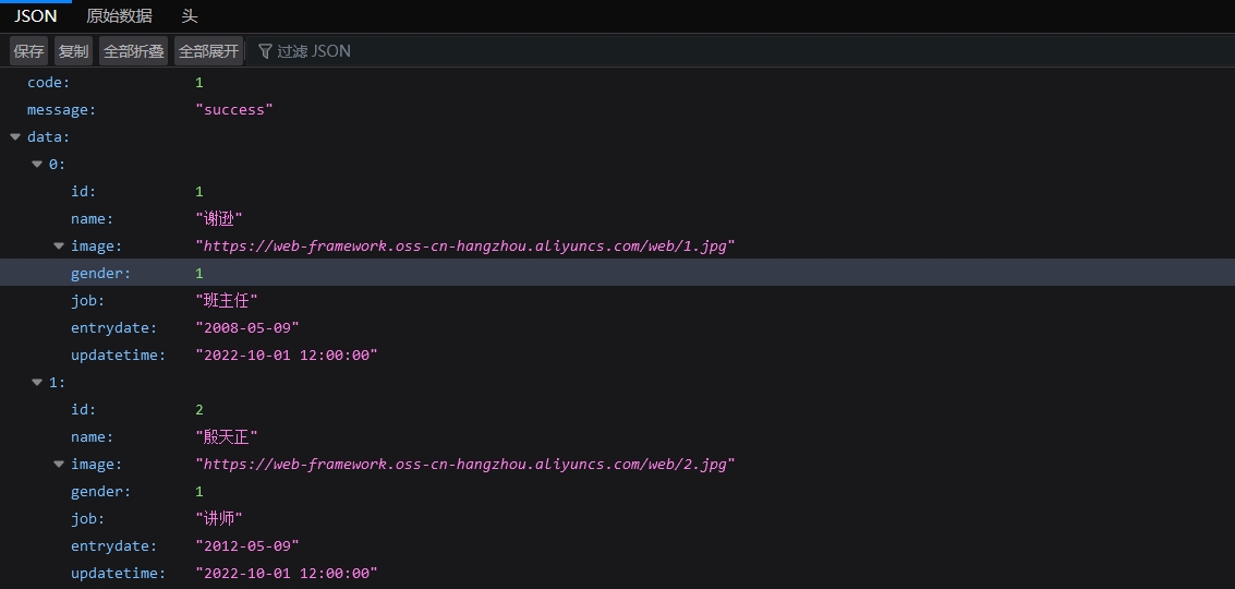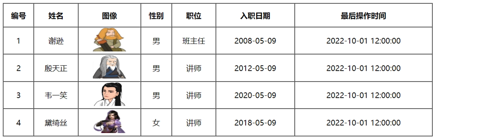 <tr>标签上通过v-for指令遍历数据,展示数据,其中需要注意的是图片的值,需要使用vue的属性绑定,男女的展示需要使用条件判断,其代码如下:<tr align="center" v-for="(emp,index) in emps"> <td>{{index + 1}}</td> <td>{{emp.name}}</td> <td> <img :src="emp.image" width="70px" height="50px"> </td> <td> <span v-if="emp.gender == 1">男</span> <span v-if="emp.gender == 2">女</span> </td> <td>{{emp.job}}</td> <td>{{emp.entrydate}}</td> <td>{{emp.updatetime}}</td> </tr>