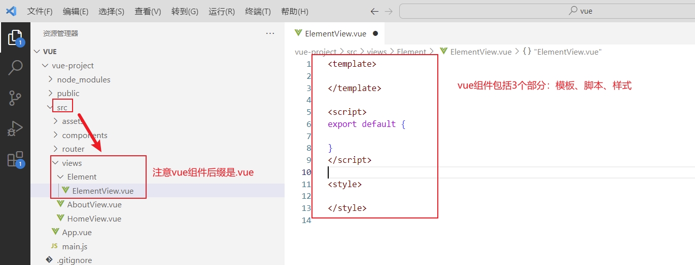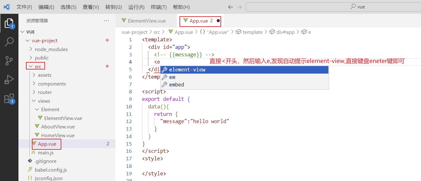 </el-menu-item>然后我们还需要在内容展示区域即App.vue中定义route-view,作为组件的切换,其App.vue的完整代码如下:
