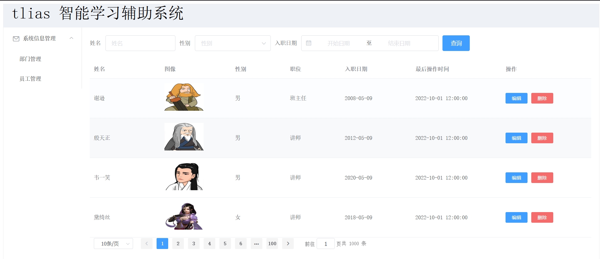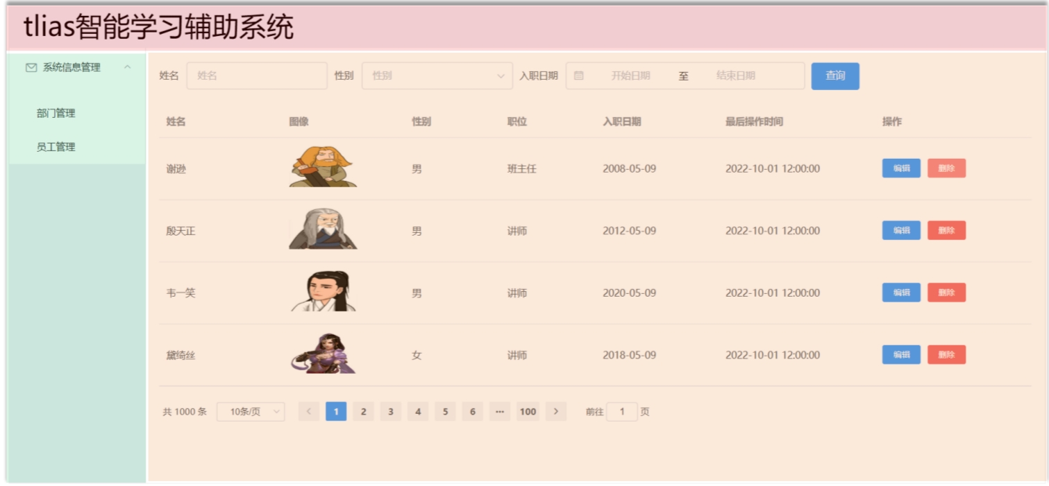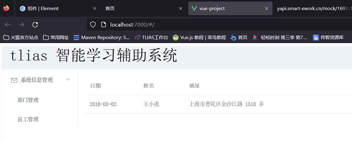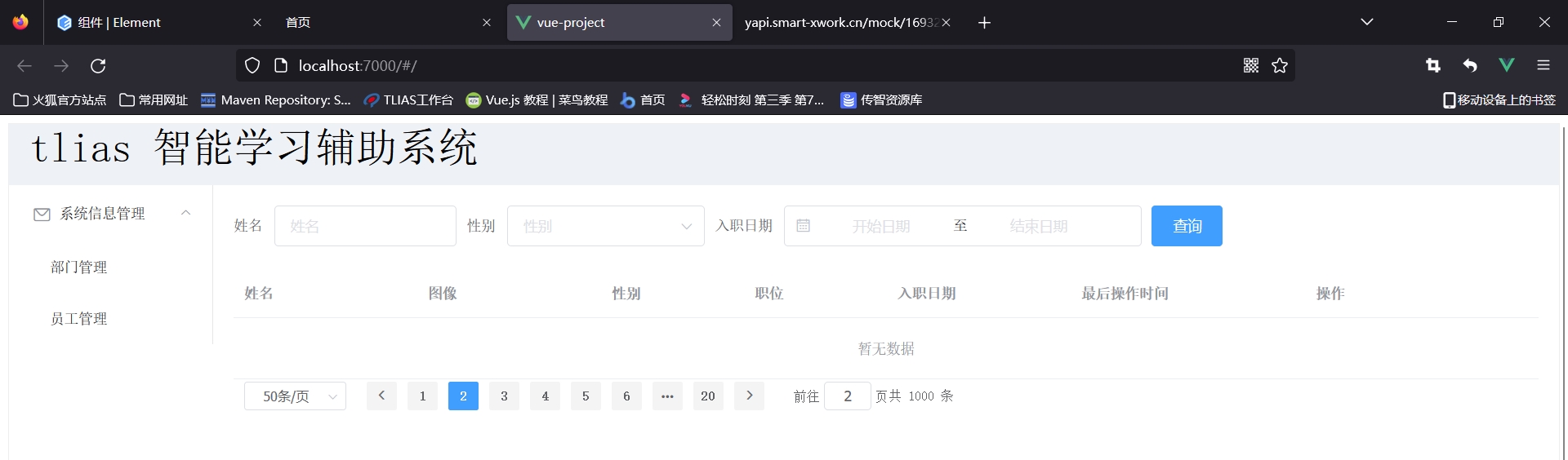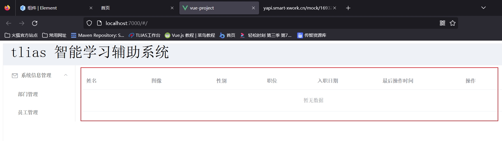 此时我们希望基于4.4案例中的功能,实现点击侧边栏的部门管理,显示部门管理的信息,点击员工管理,显示员工管理的信息,效果如下图所示: