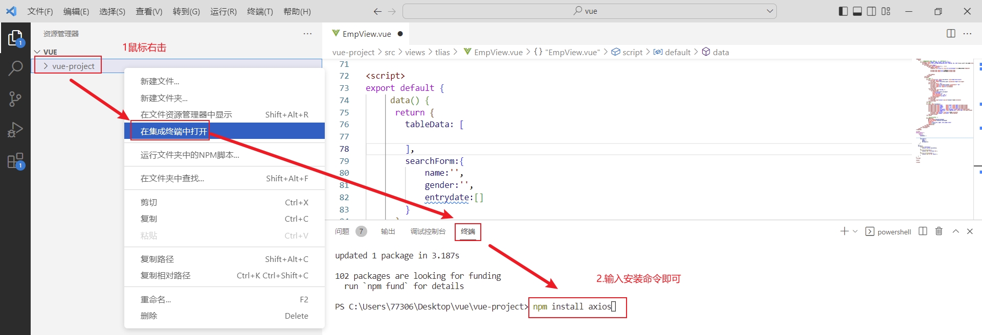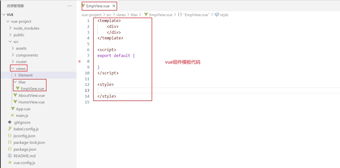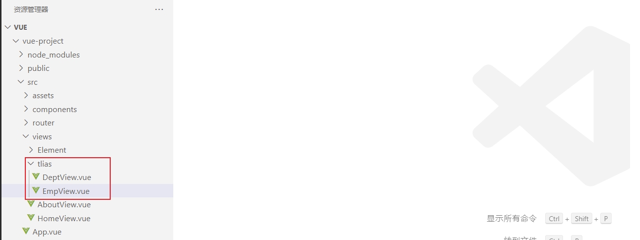 将资代码/vue-project(路由)/vue-project/src/views/tlias/DeptView.vue拷贝到我们当前EmpView.vue同级,其结构如下:
