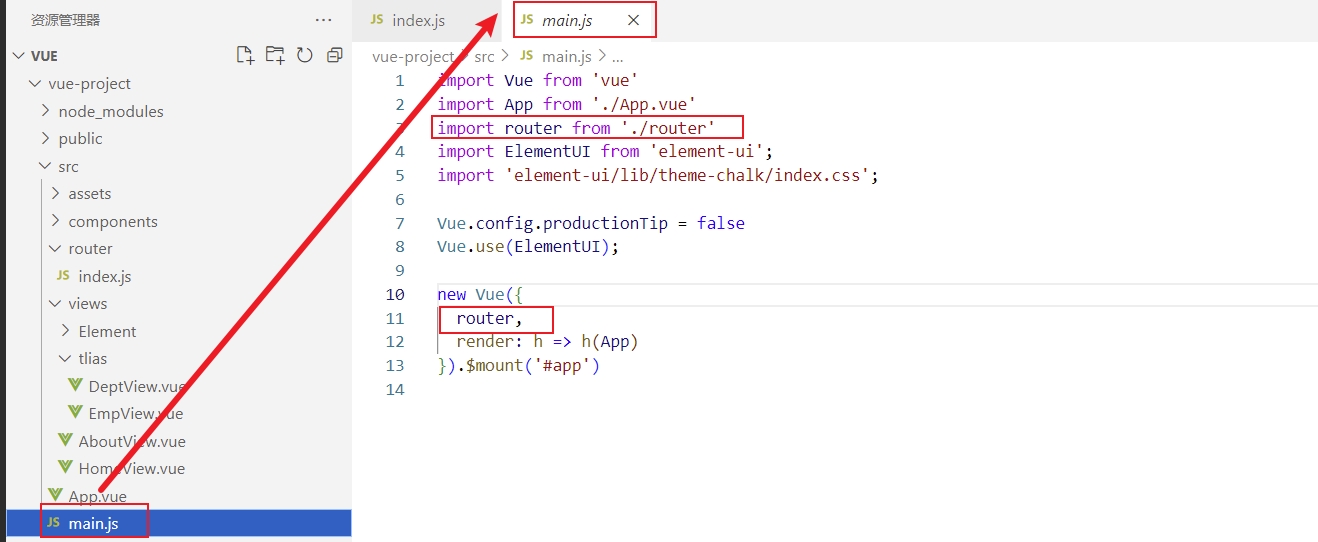 然后我们需要在src/router/index.js文件中定义路由表,根据其提供的模板代码进行修改,最终代码如下: