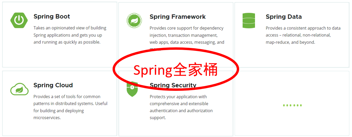 Spring 发展到今天已经形成了一种开发生态圈,Spring 提供了若干个子项目,每个项目用于完成特定的功能。而我们在项目开发时,一般会偏向于选择这一套 spring 家族的技术,来解决对应领域的问题,那我们称这一套技术为spring 全家桶。