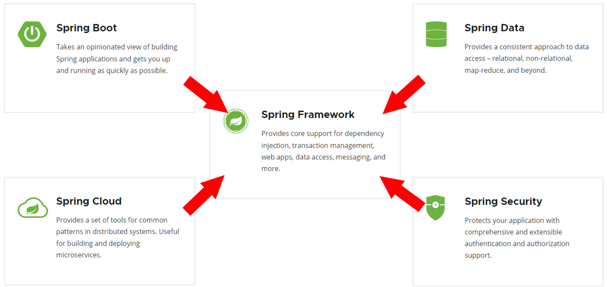 而 Spring 家族旗下这么多的技术,最基础、最核心的是 SpringFramework。其他的 spring 家族的技术,都是基于 SpringFramework 的,SpringFramework 中提供很多实用功能,如:依赖注入、事务管理、web 开发支持、数据访问、消息服务等等。
