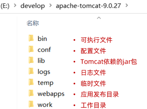 打开apache-tomcat-9.0.27目录就能看到如下目录结构,每个目录中包含的内容需要认识下