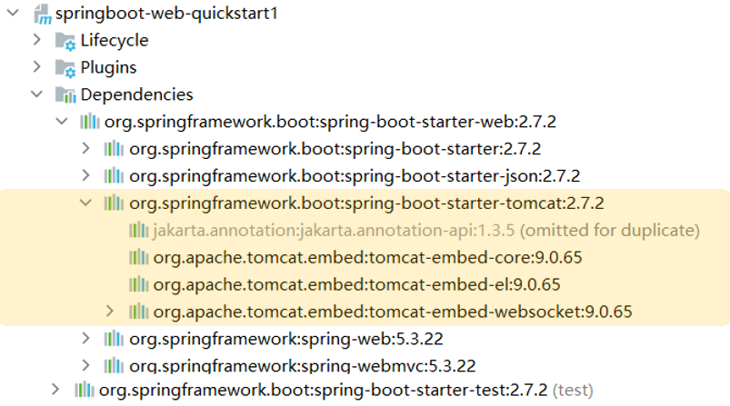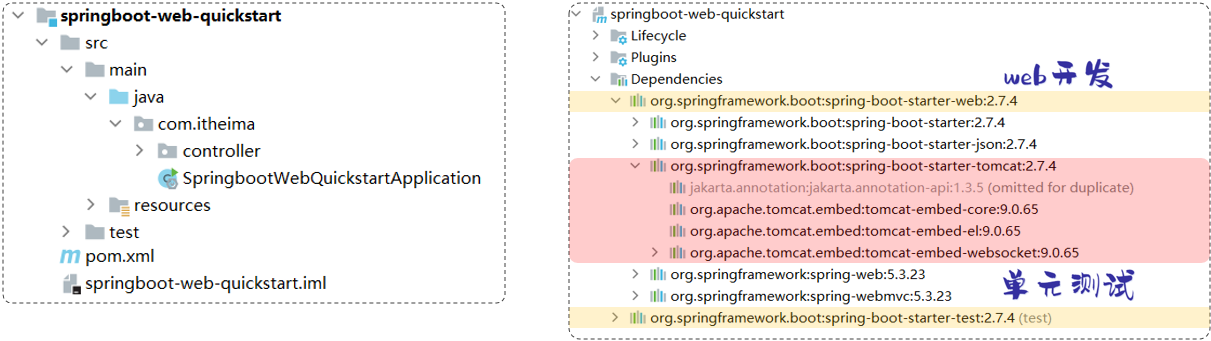 在我们之前讲解的 SpringBoot 快速入门案例中,同样也引用了:web 依赖和 test 依赖