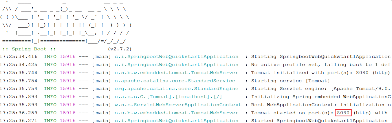 当我们运行 SpringBoot 的引导类时(运行 main 方法),就会看到命令行输出的日志,其中占用 8080 端口的就是 Tomcat。