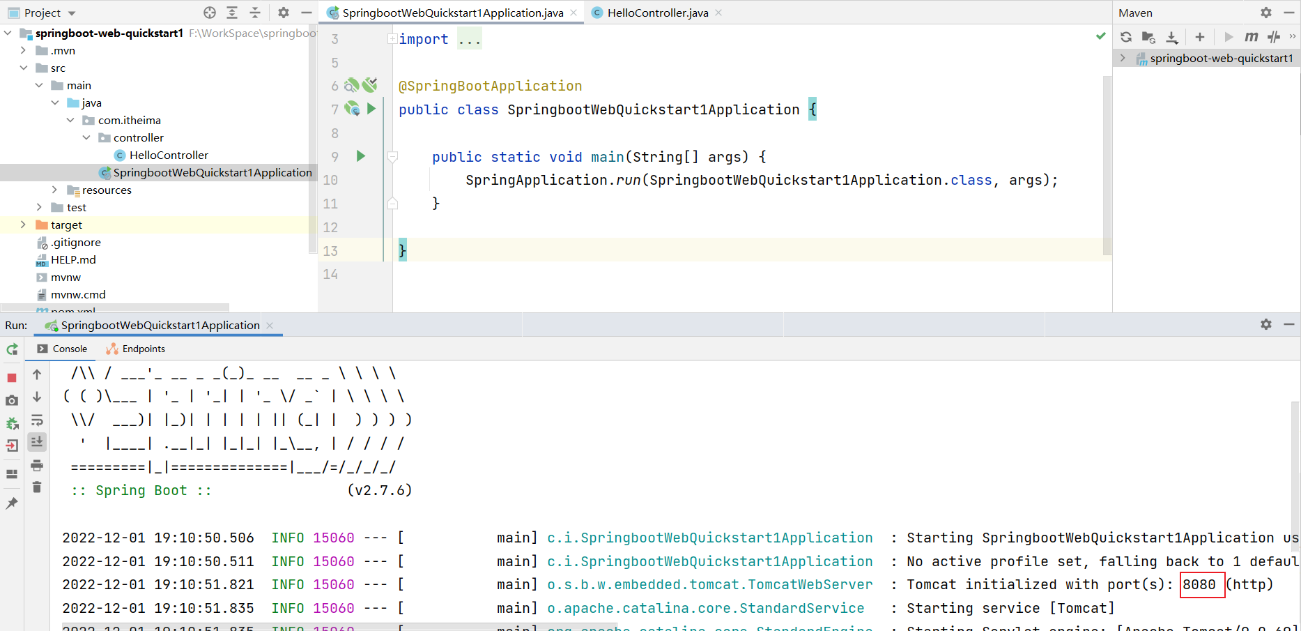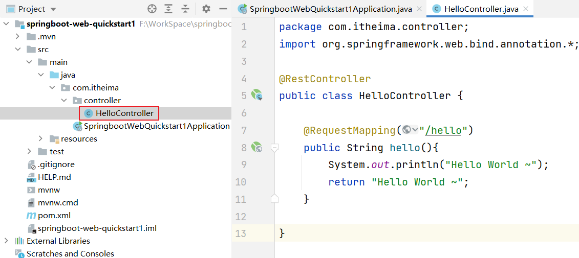 第 2 步:定义 HelloController 类,添加方法 hello,并添加注解