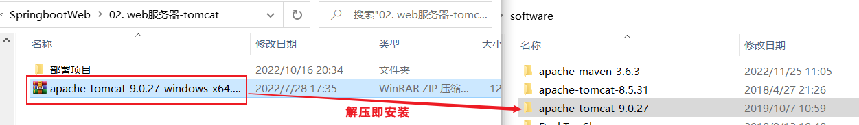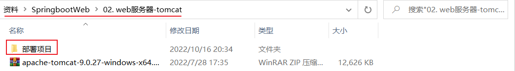 Tomcat 的软件程序 :/资料/SpringbootWeb/apache-tomcat-9.0.27-windows-x64.zip