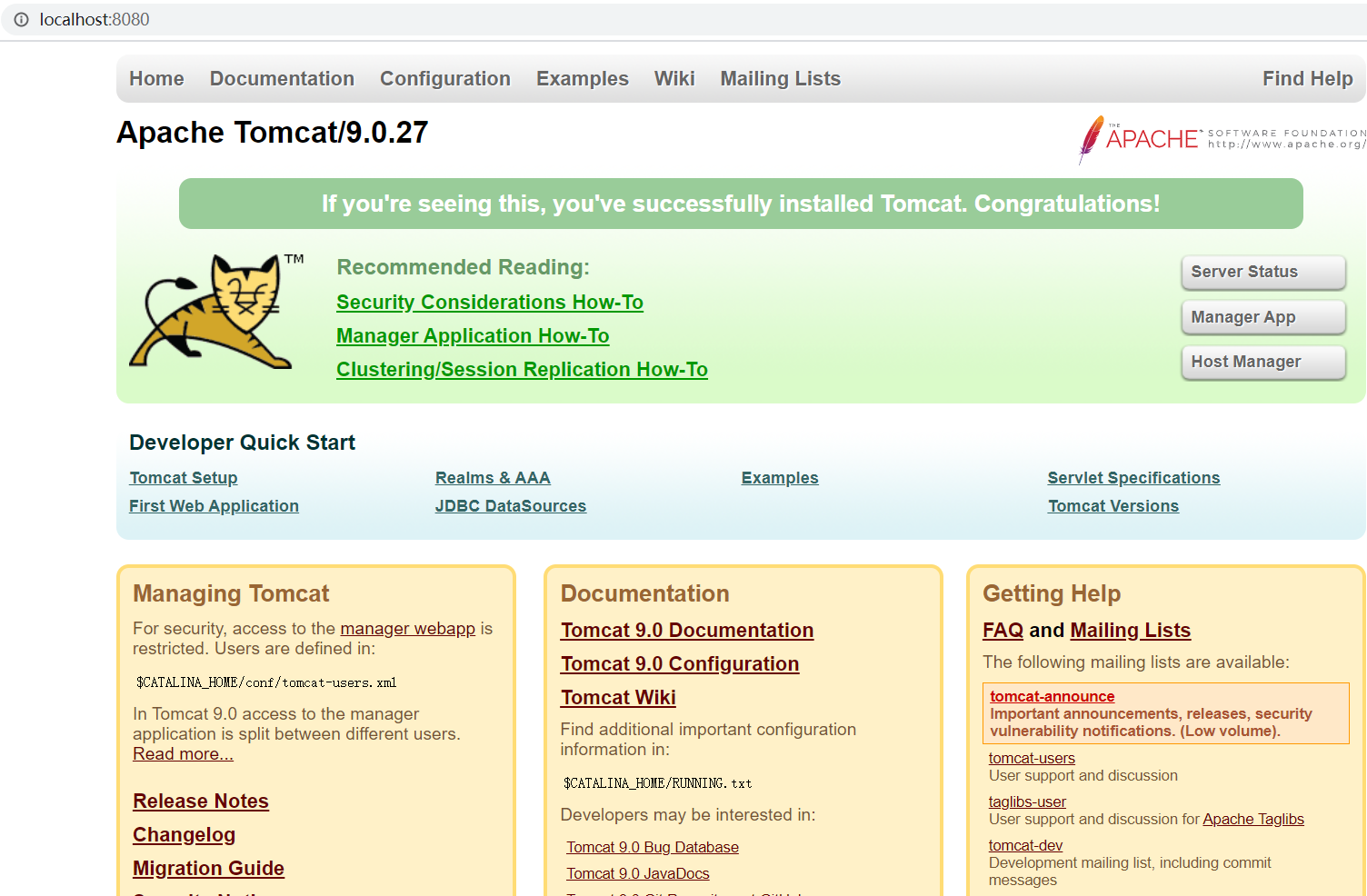 apache-tomcat-9.0.27-windows-x64.zip进行解压缩,会得到一个apache-tomcat-9.0.27的目录,Tomcat 就已经安装成功。