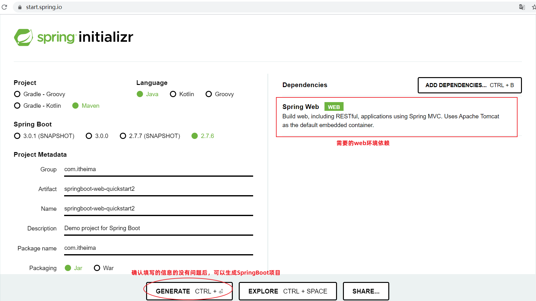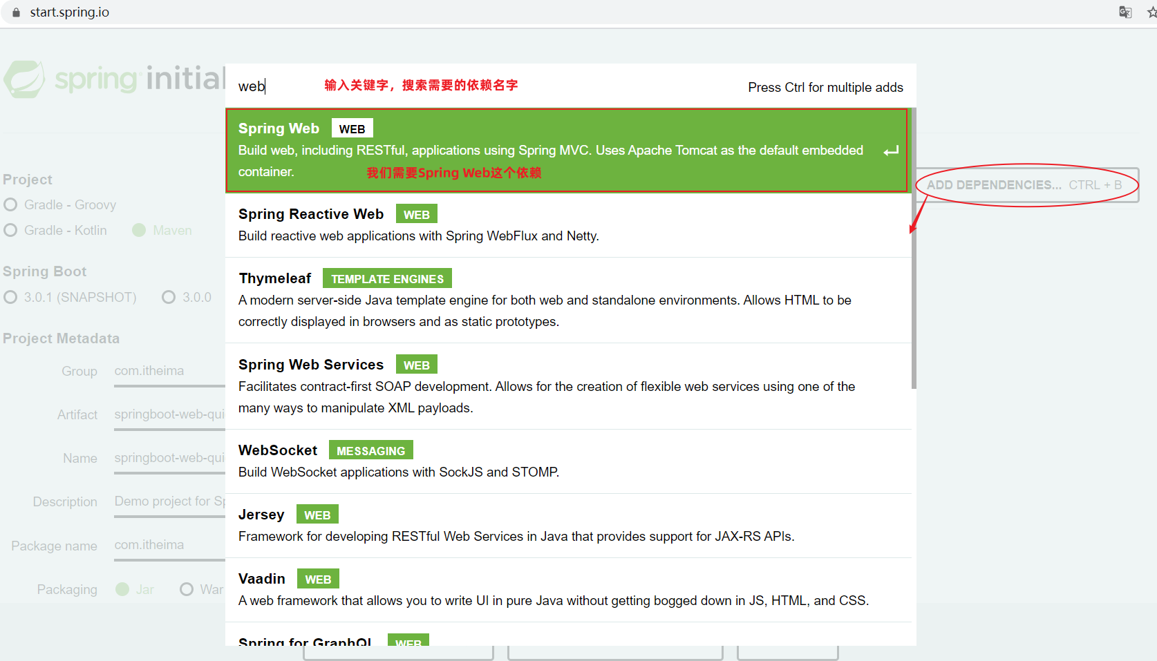 基本信息描述完毕之后,勾选 web 开发相关依赖。