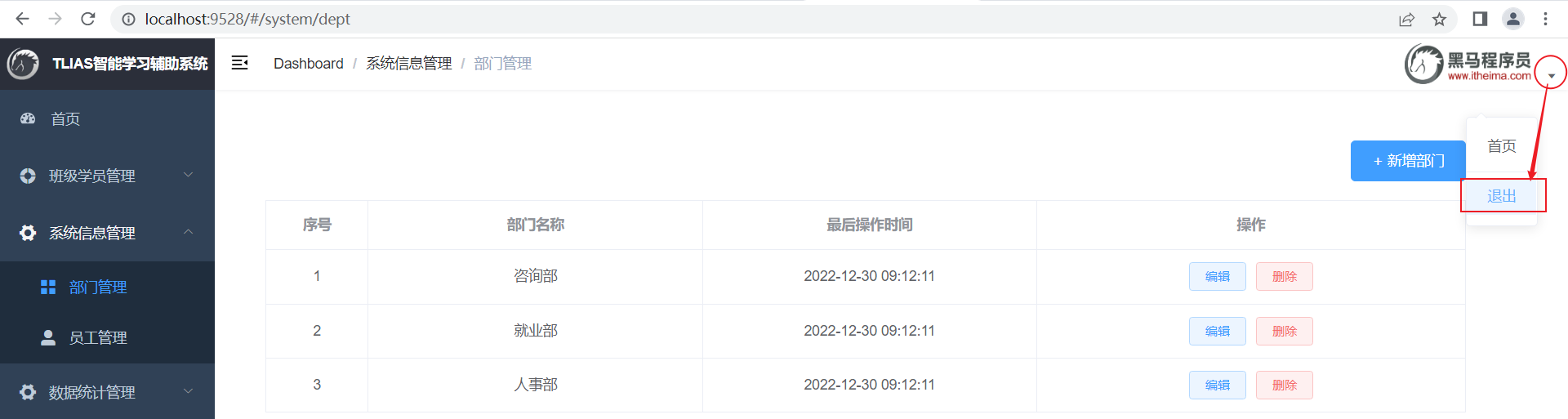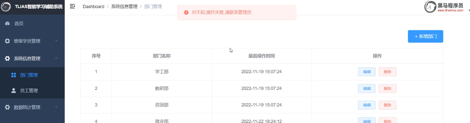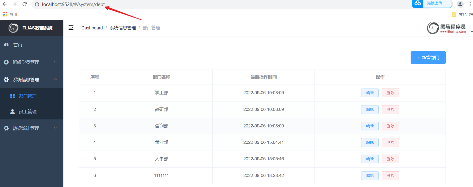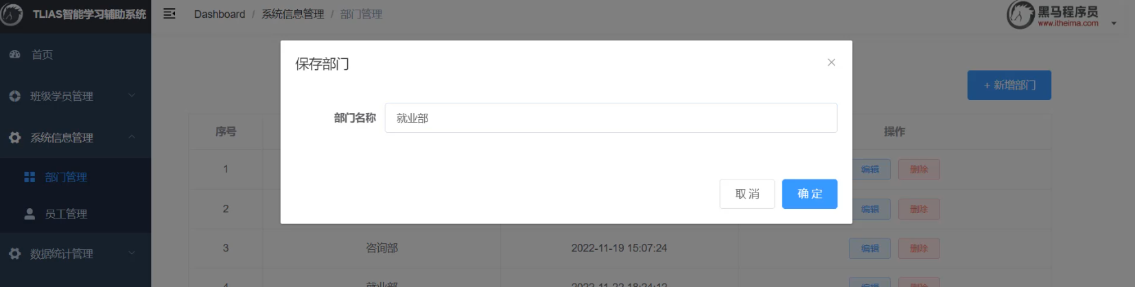 我们打开浏览器,访问系统中的新增部门操作,系统中已经有了 "就业部" 这个部门,我们再来增加一个就业部,看看会发生什么现象。