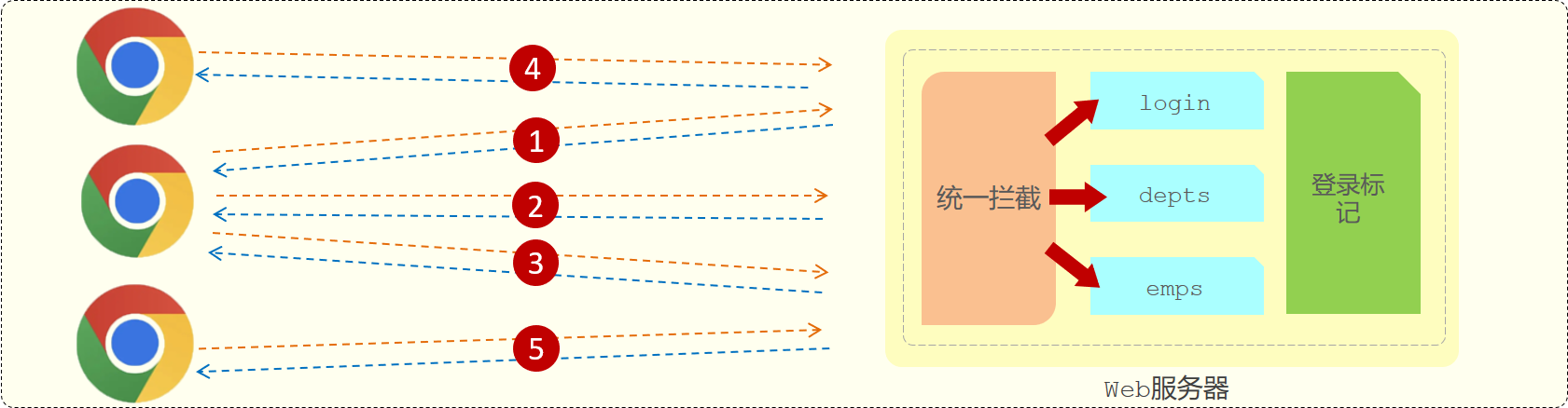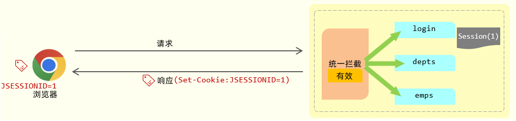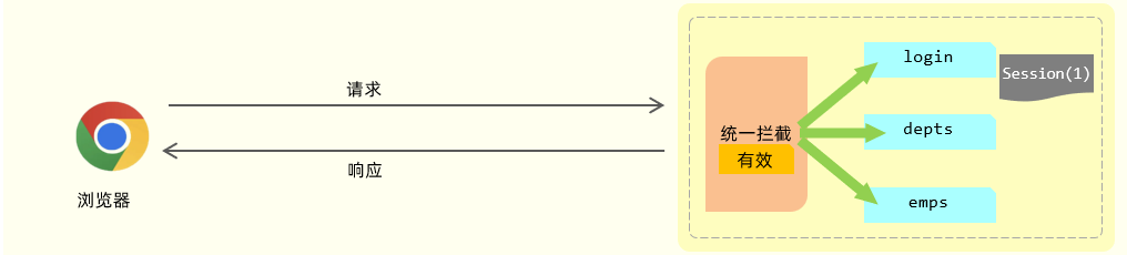 通过统一拦截的技术,我们可以来拦截浏览器发送过来的所有的请求,拦截到这个请求之后,就可以通过请求来获取之前所存入的登录标记,在获取到登录标记且标记为登录成功,就说明员工已经登录了。如果已经登录,我们就直接放行(意思就是可以访问正常的业务接口了)。