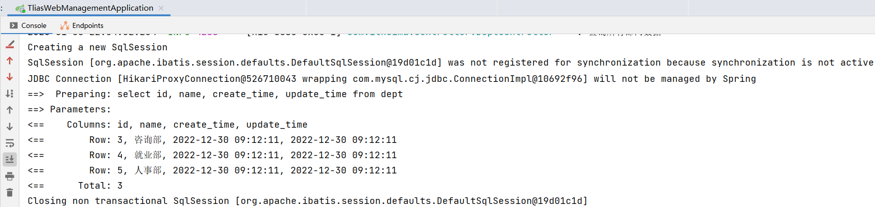 重启SpringBoot服务后,清空日志,打开Postman,测试查询部门: