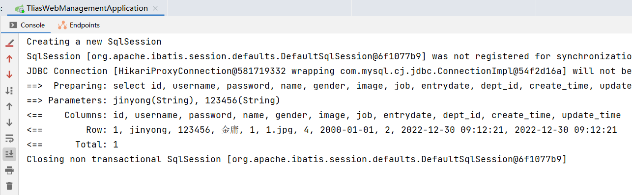 登录服务端的核心逻辑就是:接收前端请求传递的用户名和密码 ,然后再根据用户名和密码查询用户信息,如果用户信息存在,则说明用户输入的用户名和密码正确。如果查询到的用户不存在,则说明用户输入的用户名和密码错误。