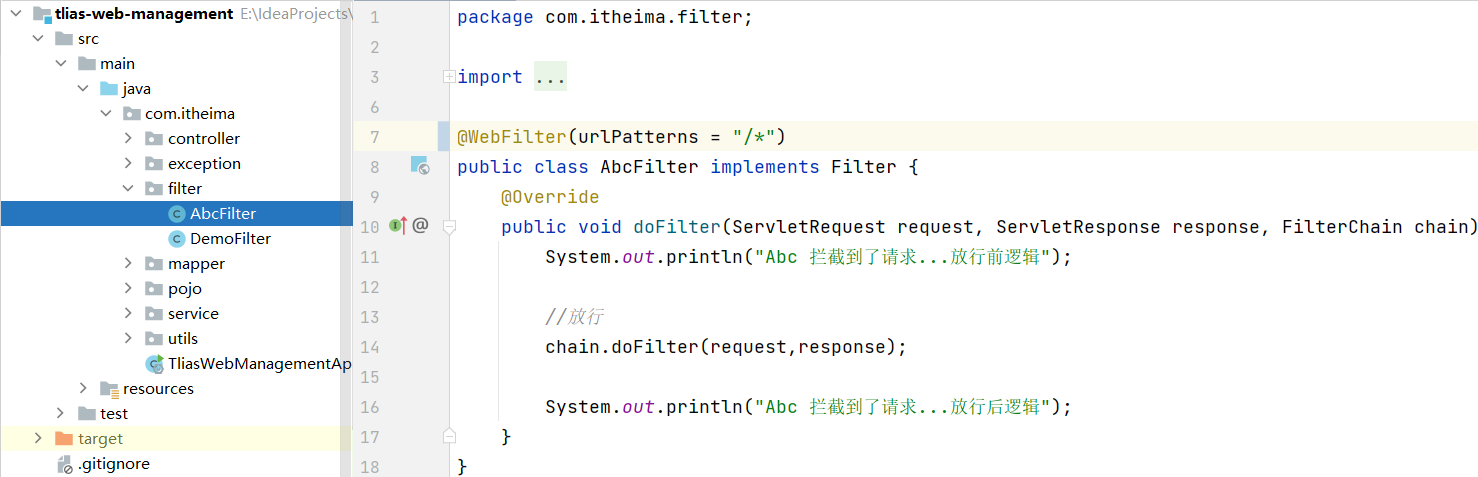 当我们打开浏览器来访问部署在web服务器当中的web应用时,此时我们所定义的过滤器会拦截到这次请求。拦截到这次请求之后,它会先执行放行前的逻辑,然后再执行放行操作。而由于我们当前是基于springboot开发的,所以放行之后是进入到了spring的环境当中,也就是要来访问我们所定义的controller当中的接口方法。