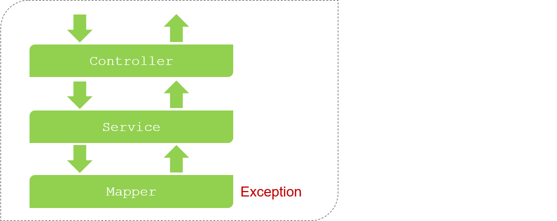 Mapper接口在操作数据库的时候出错了,此时异常会往上抛(谁调用Mapper就抛给谁),会抛给service。