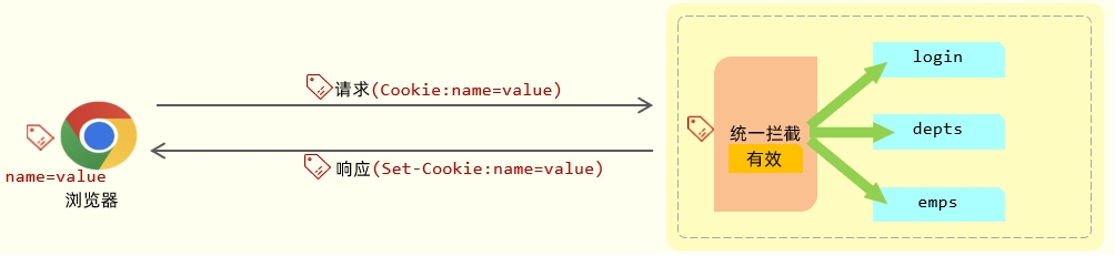 比如第一次请求了登录接口,登录接口执行完成之后,我们就可以设置一个cookie,在 cookie 当中我们就可以来存储用户相关的一些数据信息。比如我可以在 cookie 当中来存储当前登录用户的用户名,用户的ID。