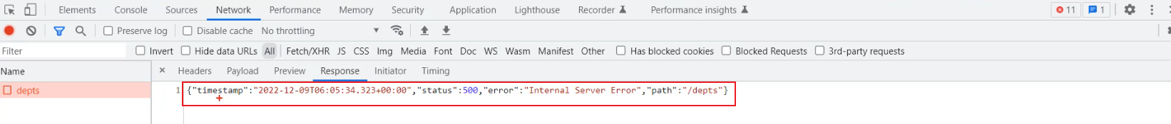 我们来看一下出现异常之后,最终服务端给前端响应回来的数据长什么样。