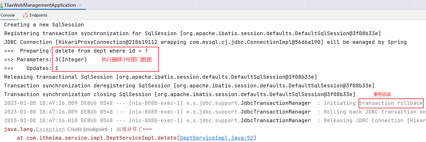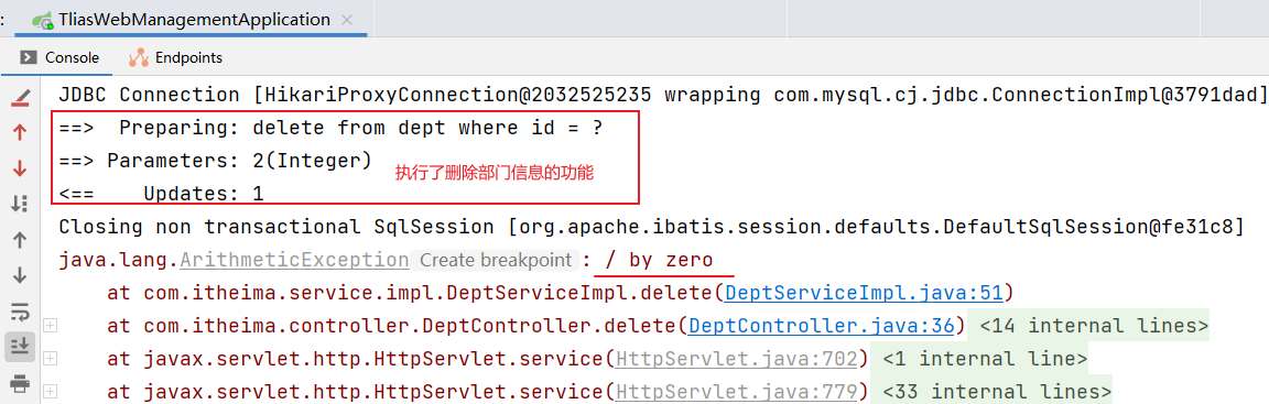 以上业务功能 delete()方法在运行时,会引发除 0 的算数运算异常(运行时异常),出现异常之后,由于我们在方法上加了@Transactional 注解进行事务管理,所以发生异常会执行 rollback 回滚操作,从而保证事务操作前后数据是一致的。
