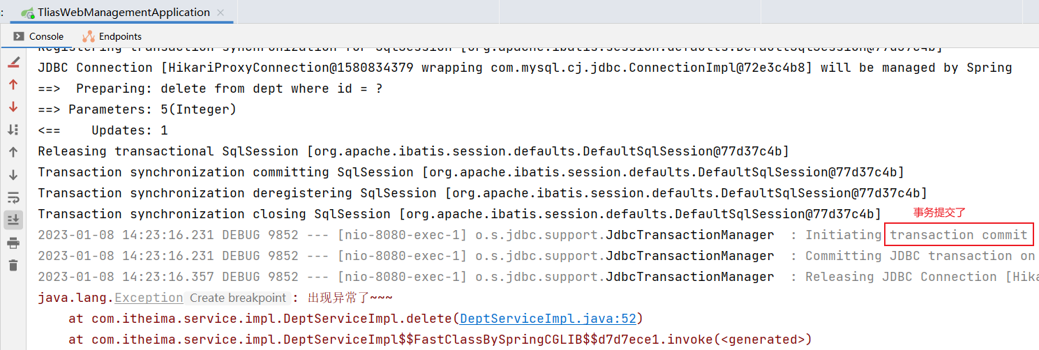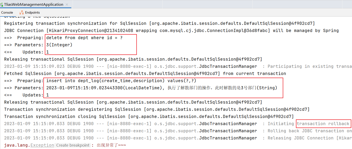 控制台日志:执行了删除 3 号部门的操作, 因为异常又进行了事务回滚