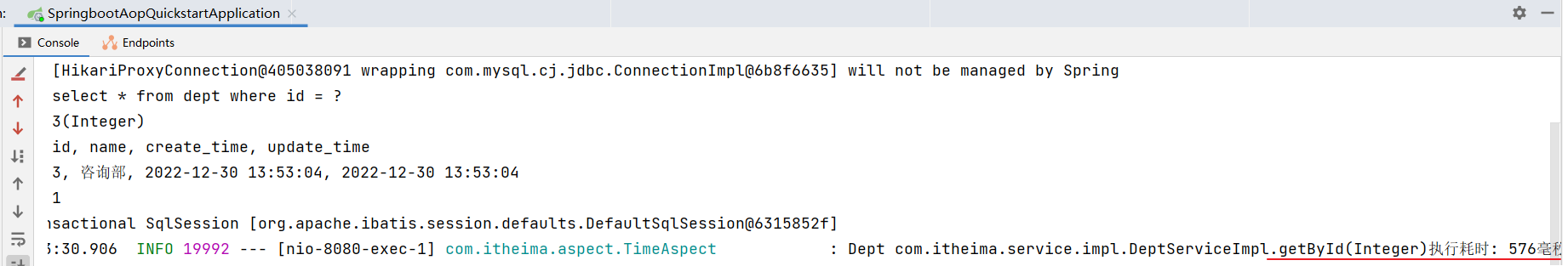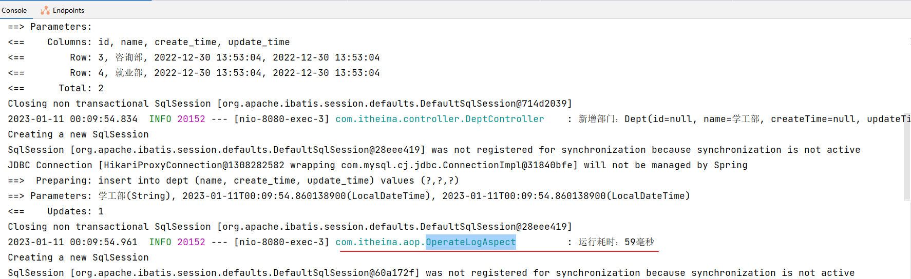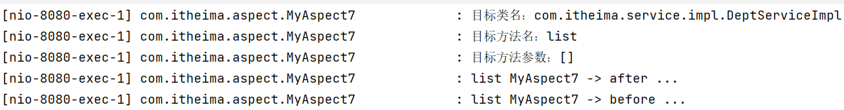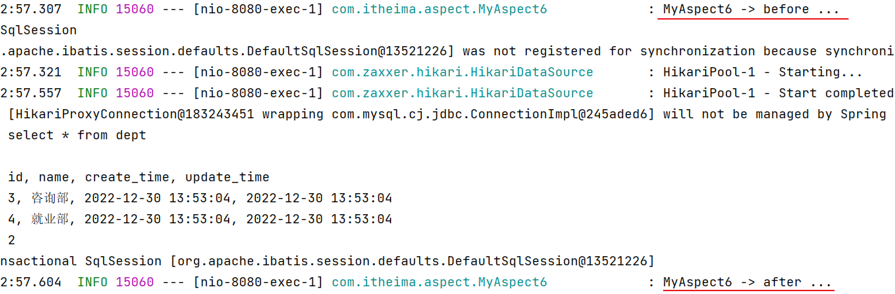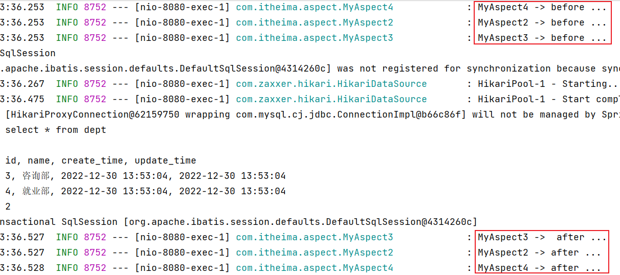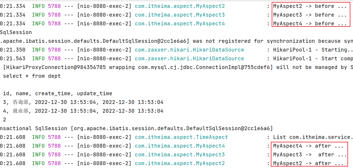 重启 SpringBoot 服务,测试查询所有部门数据,查看控制台日志: