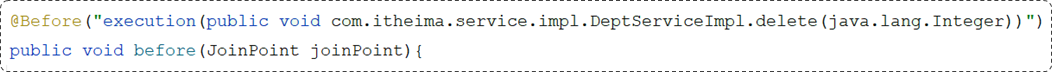 要匹配业务接口当中所有的增删改的方法,而增删改方法在命名上没有共同的前缀或后缀。此时如果使用 execution 切入点表达式也可以,但是会比较繁琐。 当遇到增删改的方法名没有规律时,就可以使用 annotation 切入点表达式