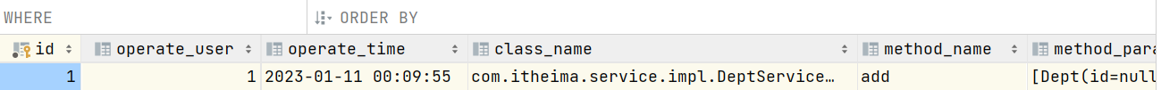 所记录的操作日志当中包括:操作人、操作时间,访问的是哪个类、哪个方法、方法运行时参数、方法的返回值、方法的运行时长。