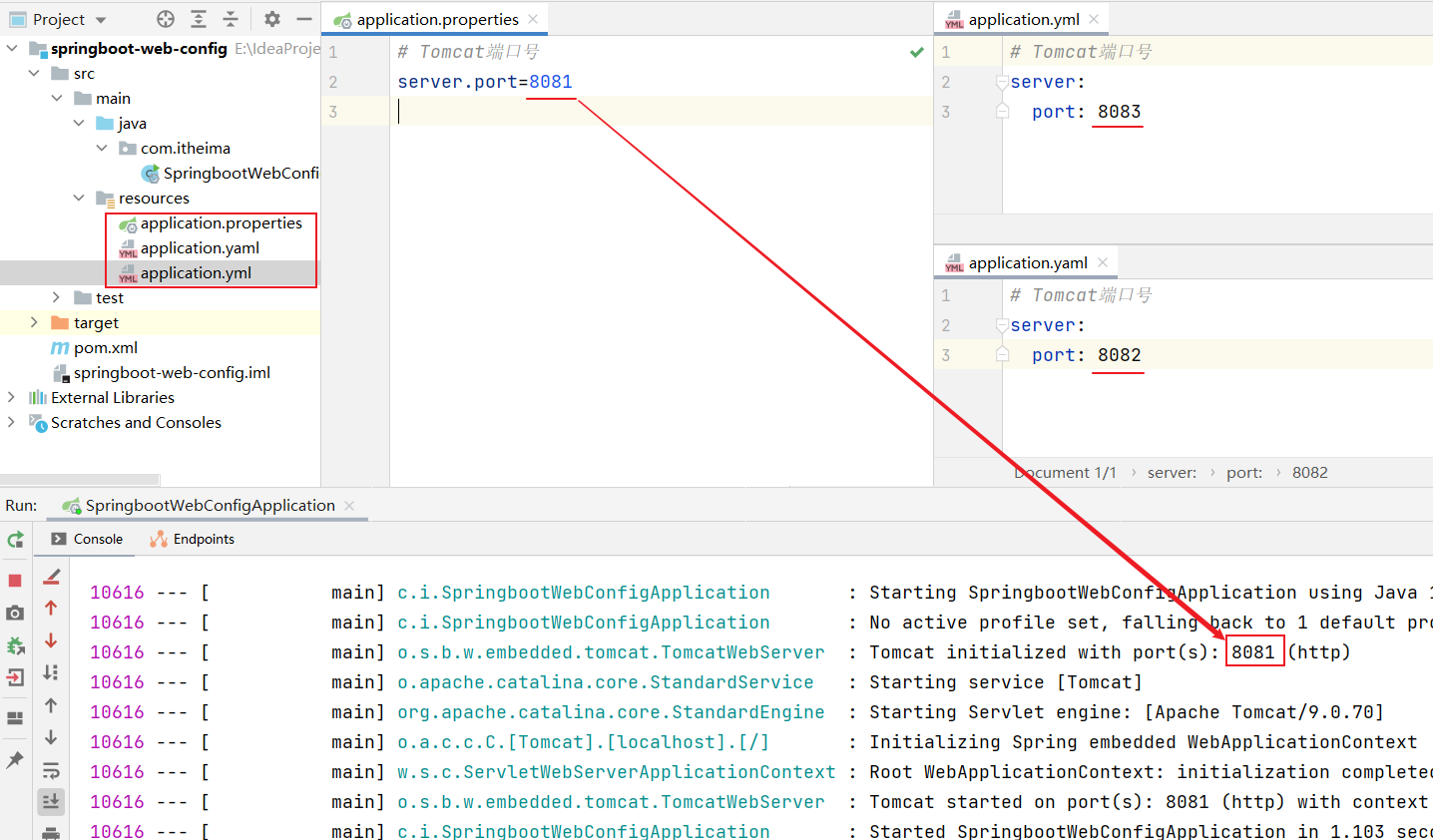 在SpringBoot项目当中,我们要想配置一个属性,可以通过这三种方式当中的任意一种来配置都可以,那么如果项目中同时存在这三种配置文件,且都配置了同一个属性,如:Tomcat端口号,到底哪一份配置文件生效呢?