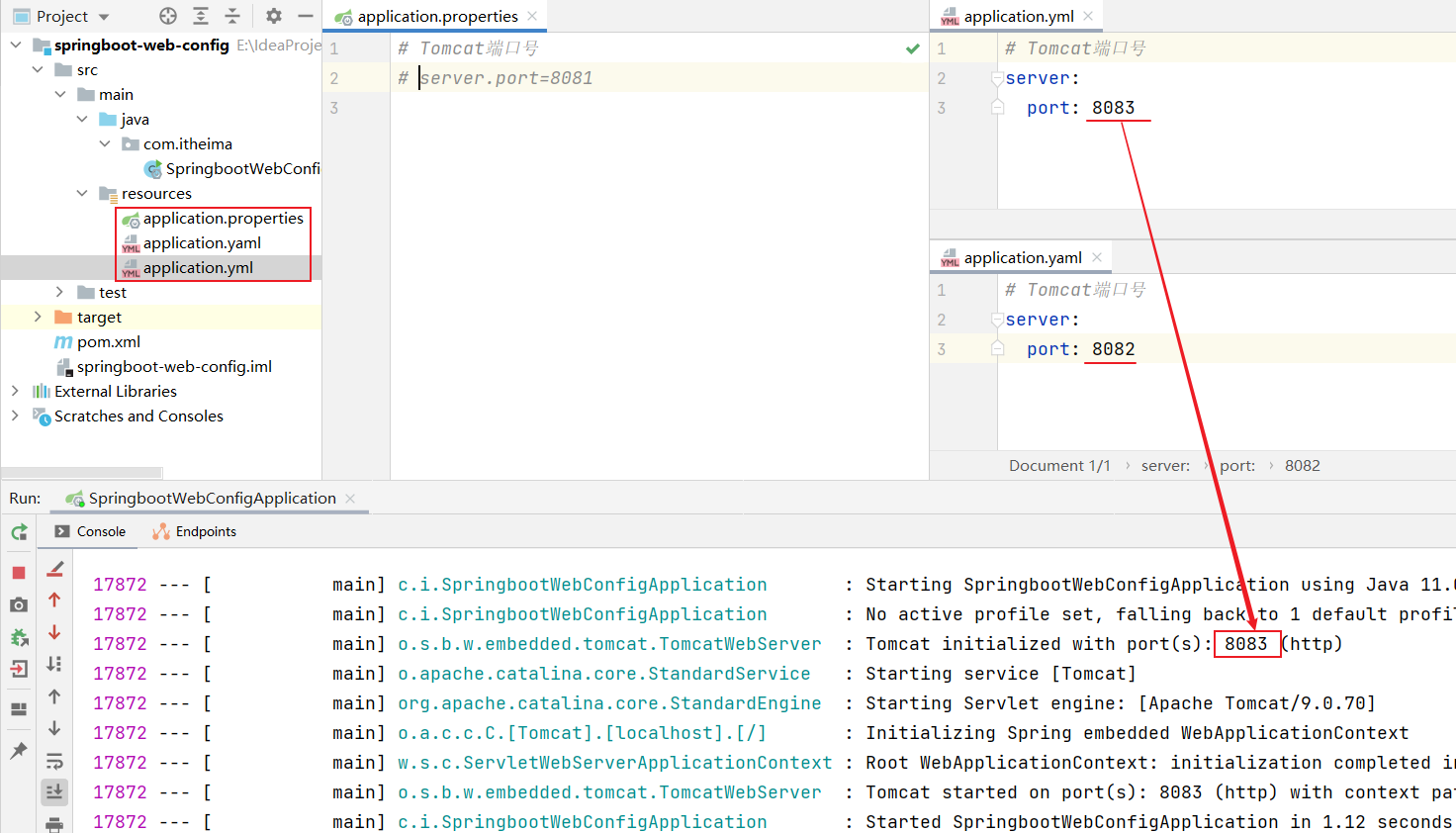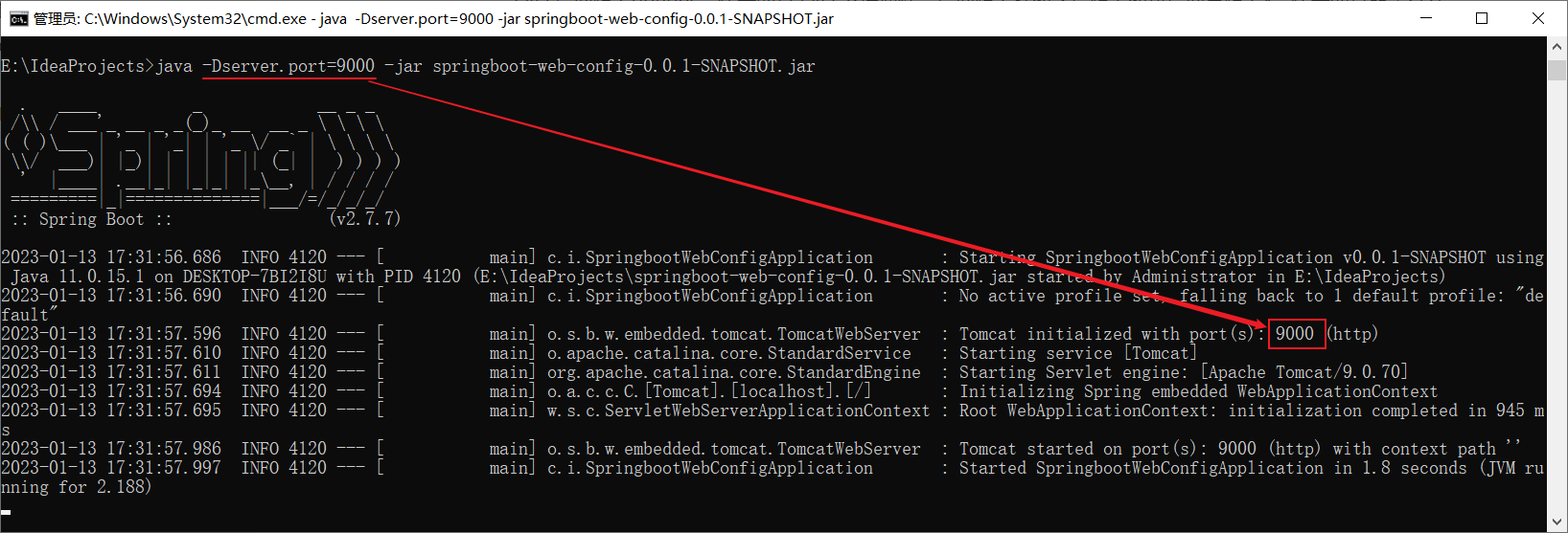 我们启动SpringBoot程序,测试下三个配置文件中哪个Tomcat端口号生效: