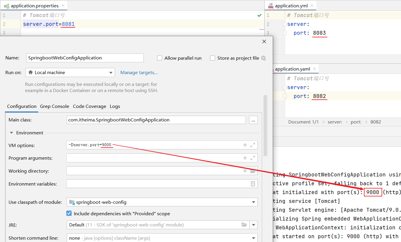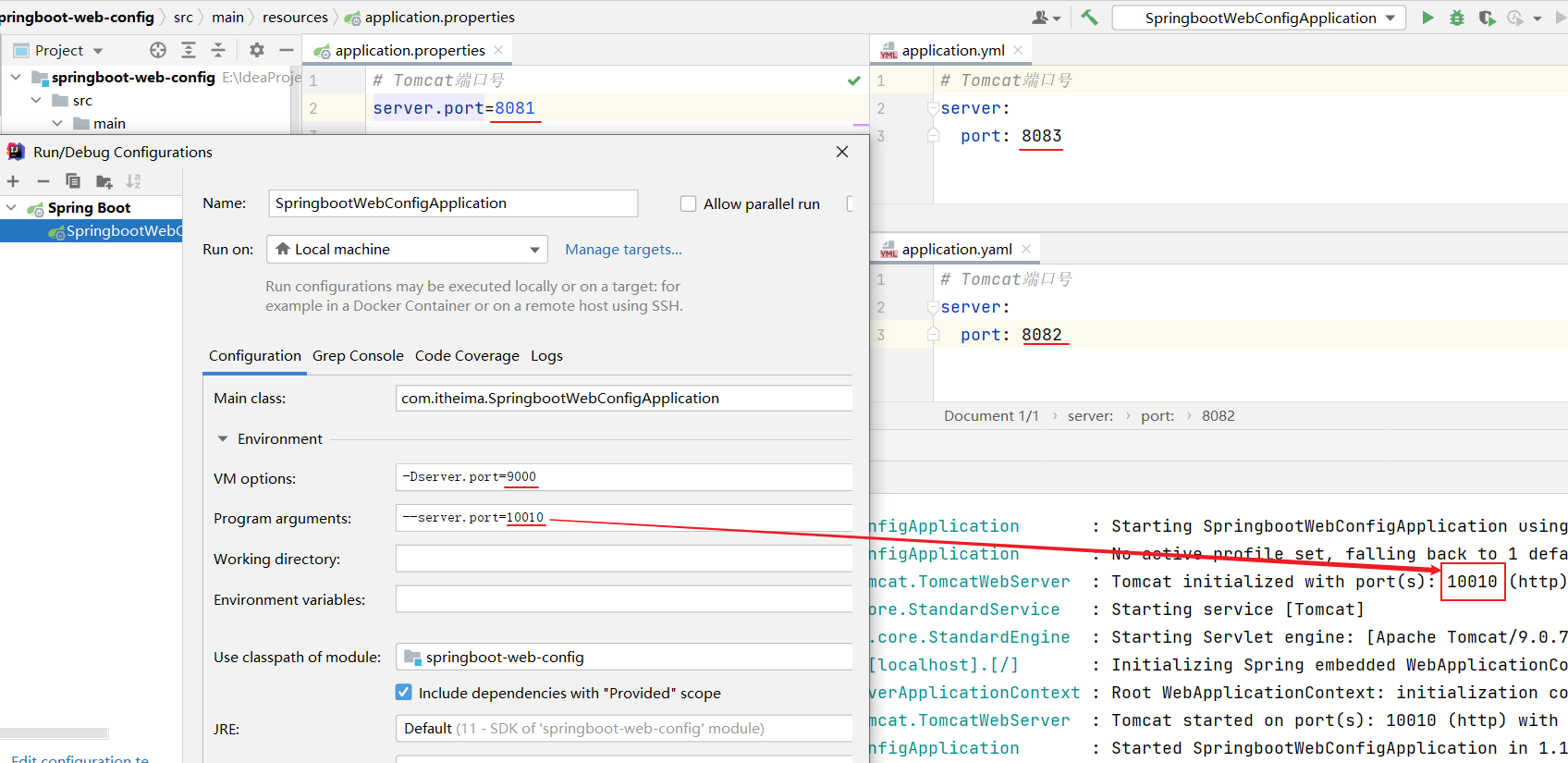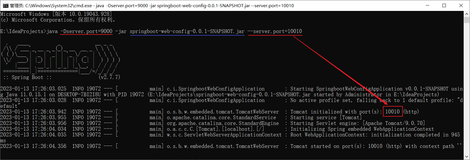 重启服务,同时配置Tomcat端口(三种配置文件、系统属性、命令行参数),测试哪个Tomcat端口号生效: