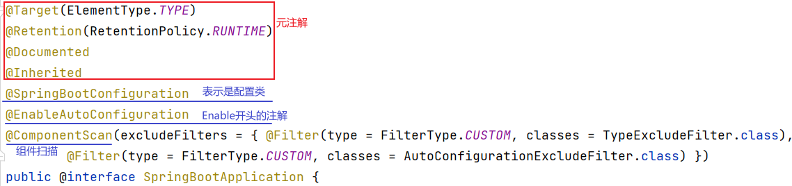 自动配置的核心就在@SpringBootApplication注解上,SpringBootApplication这个注解底层包含了3个注解,分别是: