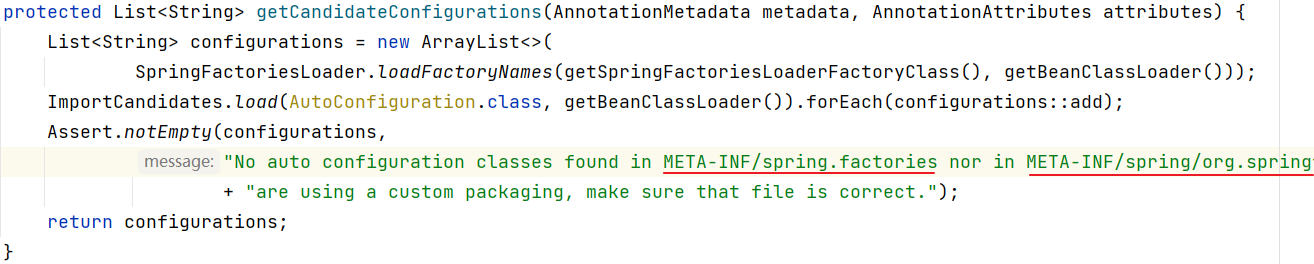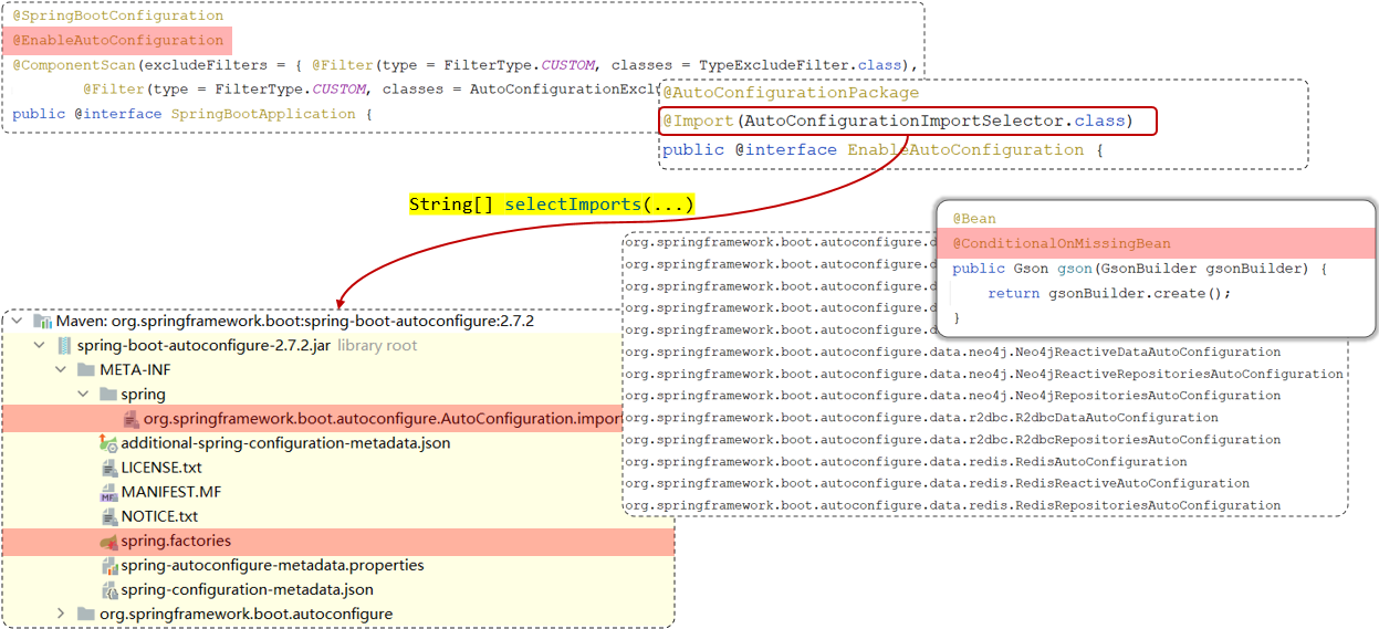 而selectImports()方法中会去读取两份配置文件,并将配置文件中定义的配置类做为selectImports()方法的返回值返回,返回值代表的就是需要将哪些类交给Spring的IOC容器进行管理。