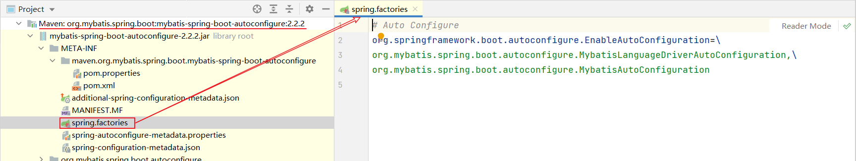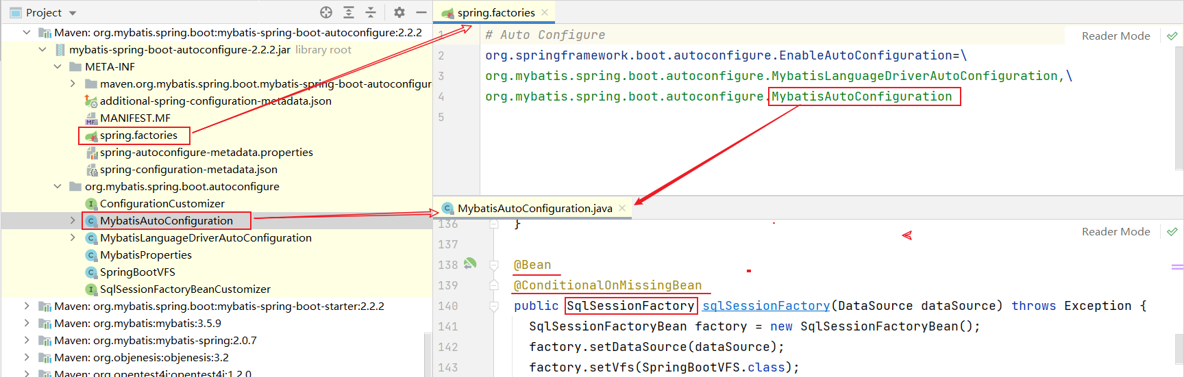 Mybatis提供了配置类,并且也提供了springboot会自动读取的配置文件。当SpringBoot项目启动时,会读取到spring.factories配置文件中的配置类并加载配置类,生成相关bean对象注册到IOC容器中。