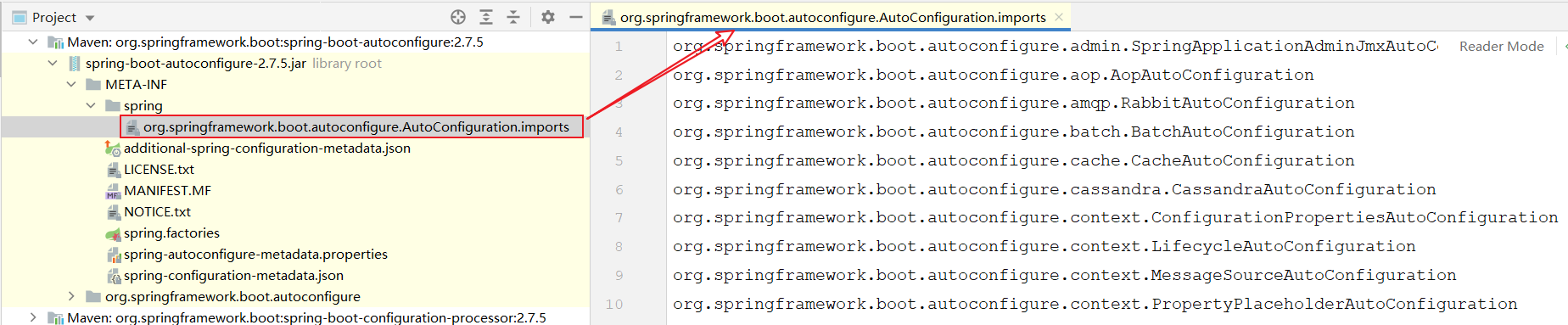 此时它会去读取两份配置文件,一份儿是 spring.factories,另外一份儿是 autoConfiguration.imports。而在 autoConfiguration.imports 这份儿文件当中,它就会去配置大量的自动配置的类。
