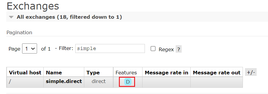 可以在RabbitMQ控制台看到持久化的交换机都会带上D的标示: