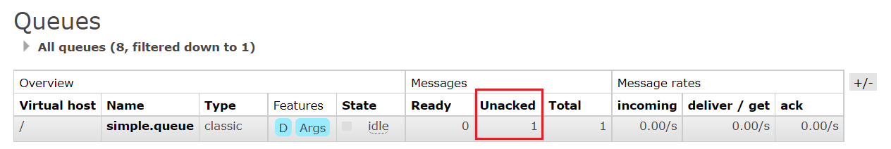 抛出异常后,因为Spring会自动返回nack,所以消息恢复至Ready状态,并且没有被RabbitMQ删除: