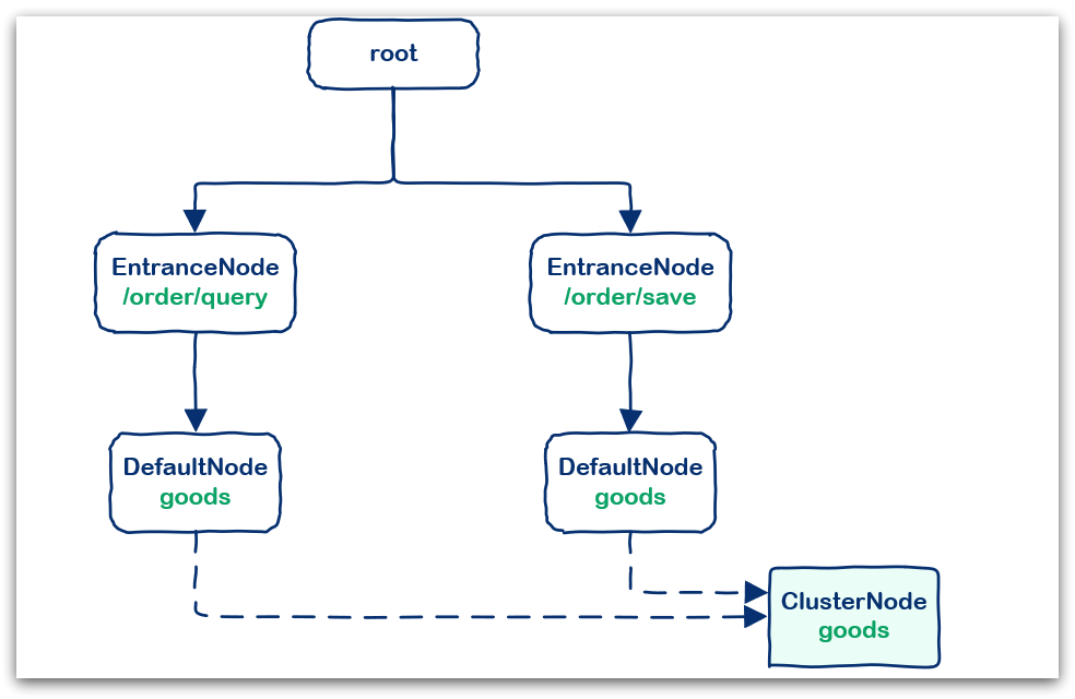 DefaultNode:代表链路树中的每一个资源,一个资源出现在不同链路中时,会创建不同的DefaultNode节点。而树的入口节点叫EntranceNode,是一种特殊的DefaultNode