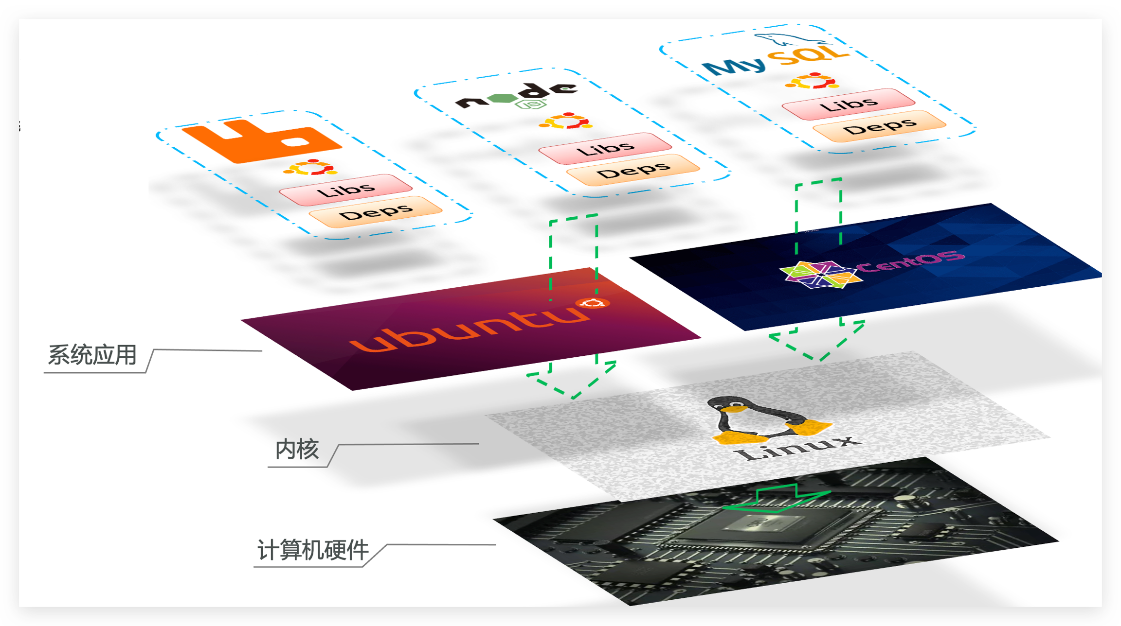 这样打包好的应用包中,既包含应用本身,也保护应用所需要的Libs、Deps,无需再操作系统上安装这些,自然就不存在不同应用之间的兼容问题了。