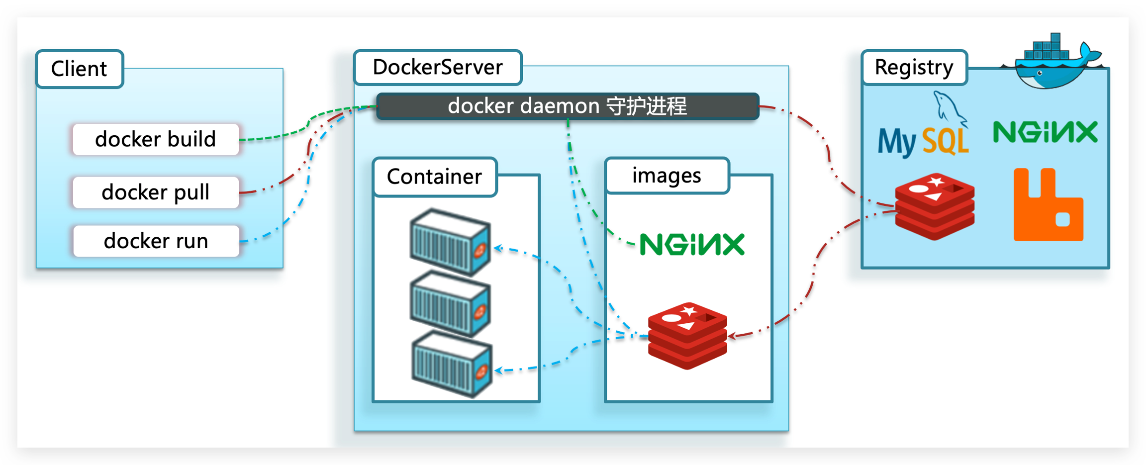 服务端(server):Docker守护进程,负责处理Docker指令,管理镜像、容器等