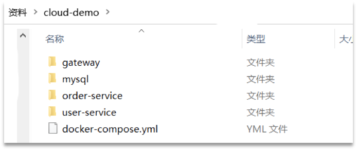 查看课前资料提供的cloud-demo文件夹,里面已经编写好了docker-compose文件,而且每个微服务都准备了一个独立的目录: